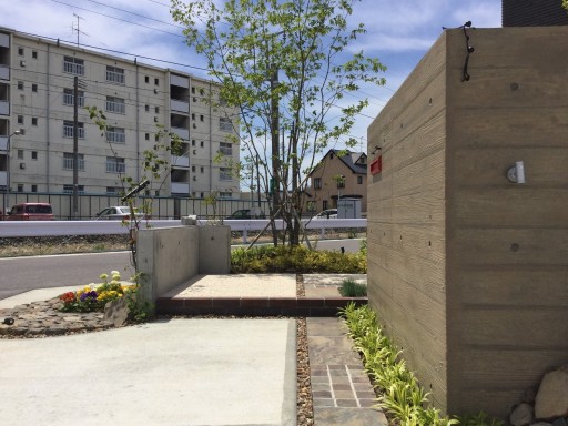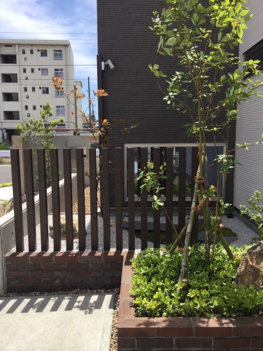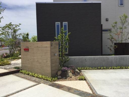 杉板RCのお洒落な門と緑豊かな庭